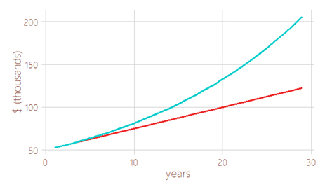 In the example below, the blue line represents compound interest and the red line represents simple interest (interest paid on your original investment principal only.) A $50,000 principal invested at 5% interest, compounded annually over 30 years, will grow to $216,097, which is $91,097 more than if only simple interest is earned. And the more frequent the compounding period, say monthly or daily, the faster your money grows.